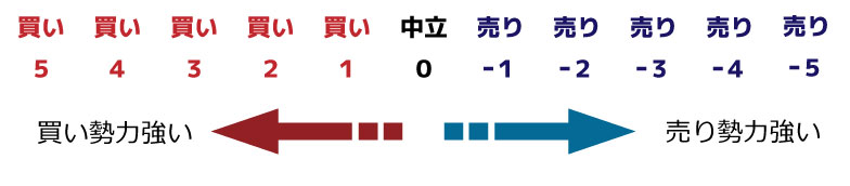 「転換線と価格」・「基準線と価格」・「転換線と基準線」・「雲の領域と価格」・「遅行スパンと価格」の5つから総合判定。